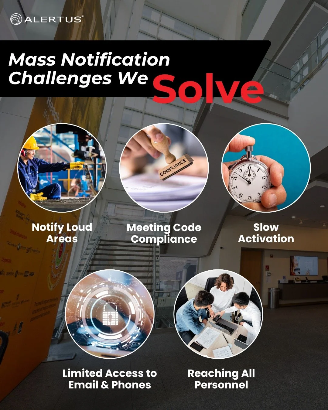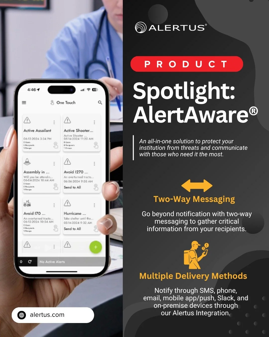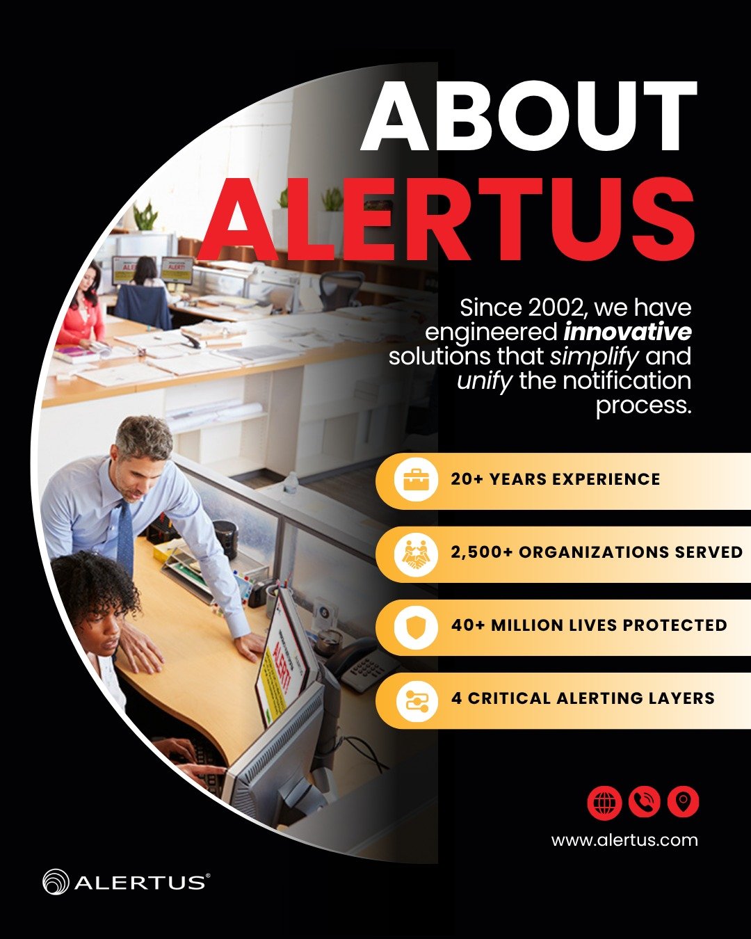 Alertus’ team of safety, security, and technology leaders is committed to raising the bar for mass notification. No matter how many alerting endpoints or integrated systems your organization has, the Alertus System unifies them under one powerful, cost-effective platform. Serving over 2,500 organizations across 40+ countries, Alertus protects millions of people and is trusted by customers across many industries, including higher education, K-12, healthcare, commercial and industrial sectors.