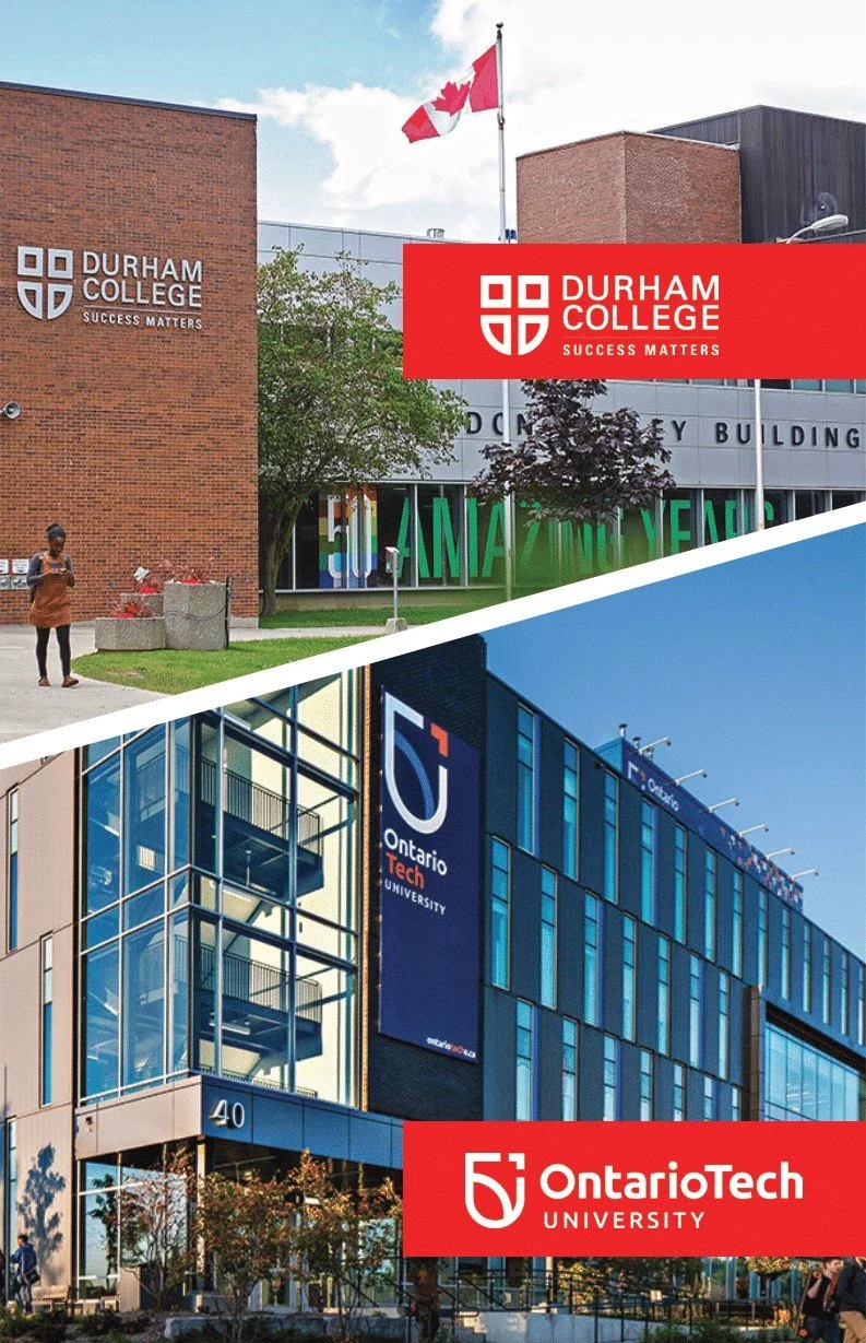 Durham College of Applied Arts and Technology (Durham College) and Ontario Tech University (Ontario Tech U) are partnered post-secondary institutions located parallel to each other in Oshawa, Ontario, Canada. Between their campuses, Durham College and Ontario Tech U’s student and staff population is about 40,000. Both institutions offer a range of programs and maintain a vibrant campus community with many housing options, health and medical clinics, food establishments, sporting fields, facilities, and much more. Through the partnership, students at Durham can qualify for advanced standing in programs offered by Ontario Tech U.
